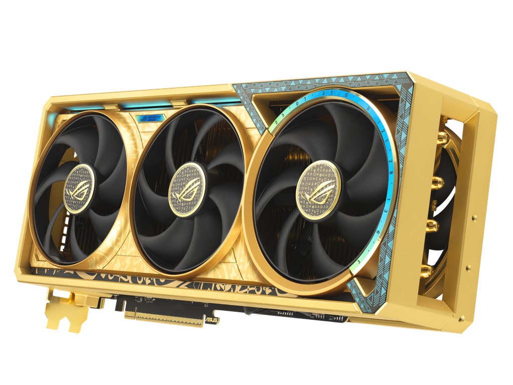 這張 RTX 5080 金顯磚在常規(guī)版 Astral“夜神”的基礎(chǔ)上整體改用金色外觀設(shè)計(jì),正面裝飾以阿拉伯書法,背板則有當(dāng)?shù)靥厣鸟橊勆剃?duì)和摩天大樓圖案,此外其右側(cè)正反風(fēng)扇位均裝飾以馬賽克蔓藤花紋。