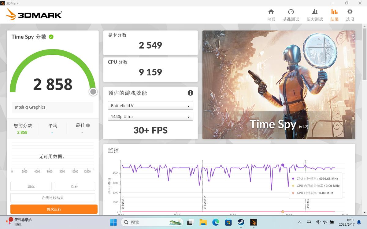 ▲3Dmark測試主要反映顯卡的理論性能,在3Dmark TimeSpy測試中,該機型顯卡分?jǐn)?shù)為2549。需要注意的是,想要完整發(fā)揮Arc核顯性能,需滿足雙通道內(nèi)存且內(nèi)存總?cè)萘看笥?6GB。