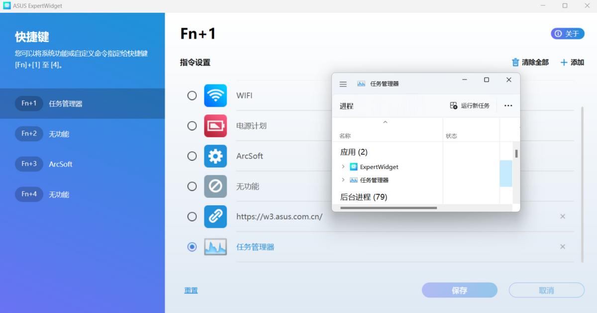 ▲在ASUS ExpertWidget中,可以對商用藍鍵進行功能自定義,比如切換電源性能模式、打開特定網(wǎng)址鏈接。進一步提升快捷鍵的接管程度,滿足一鍵直達的高效率要求。