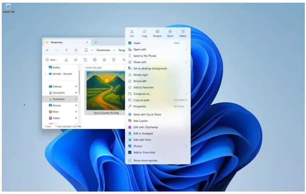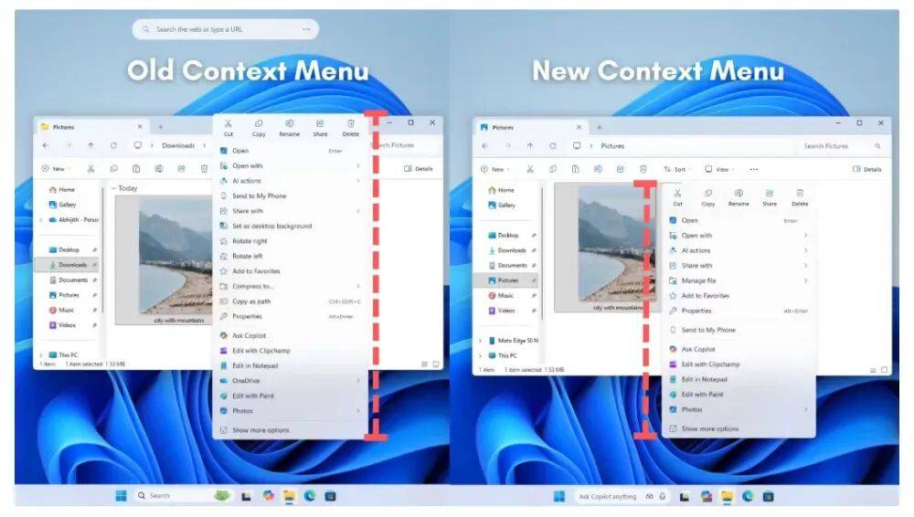 微軟引入了一個(gè)名為“管理文件”(Manage file)的全新子菜單,收納“壓縮到 ZIP 文件”、“復(fù)制為路徑”、“設(shè)為桌面背景”以及圖片的“向左旋轉(zhuǎn)”和“向右旋轉(zhuǎn)”等五個(gè)獨(dú)立選項(xiàng)。